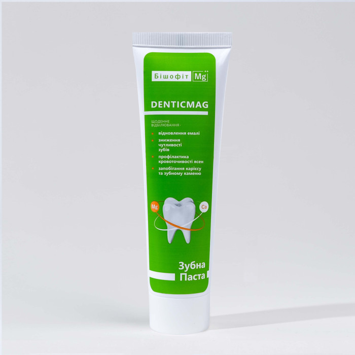 Містить м'які абразивні речовини природного походження. Збагачена магнієм, що сприяє догляду за зубною емаллю. Паста Denticmag містить цитрат цинку, який допомагає зменшити утворення нальоту та неприємний запах. У поєднанні з ментолом та олією м'яти забезпечує відчуття свіжості.