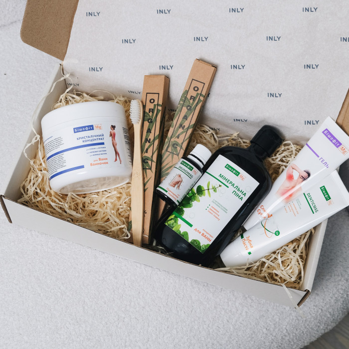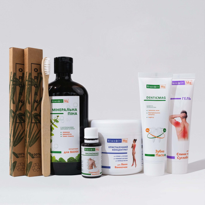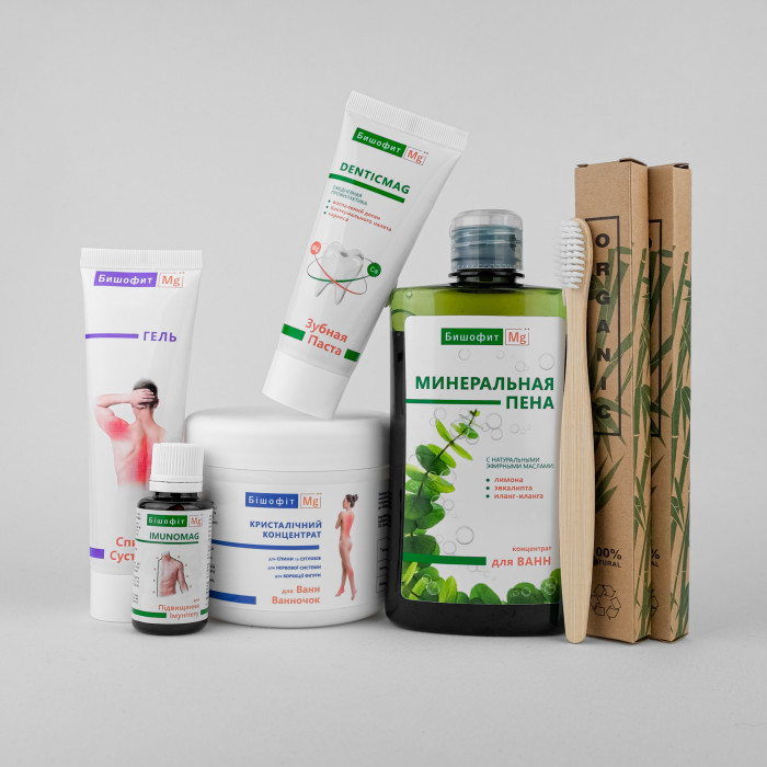 Подарунковий набір Для родини – комплекс топових продуктів Бішофіт Mg++ на основі бішофіту Полтавського родовища, доповнені природними екстрактами та ефірними оліями.