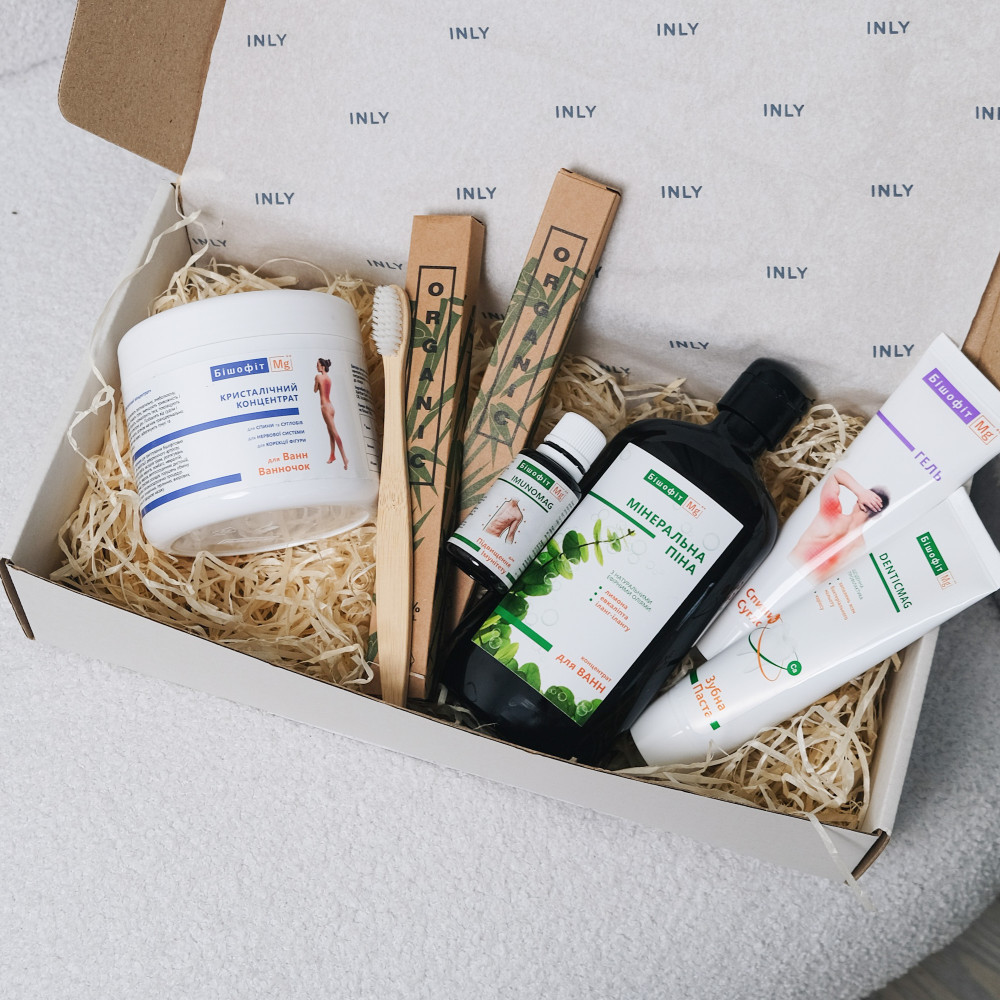 У наборі є засоби для зовнішнього застосування, дієтичні добавки, засіб для ванн, і навіть продукти для гігієни ротової порожнини.