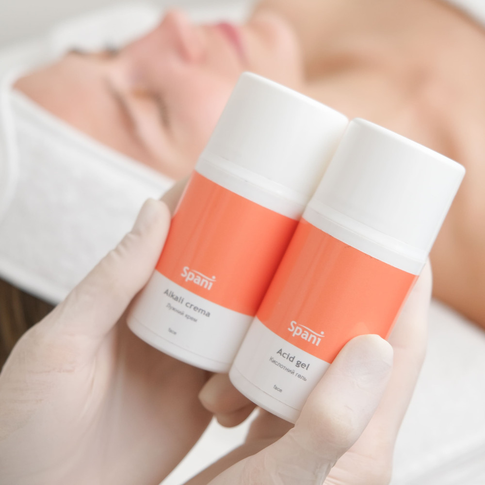 Поверх лужного крему нанесіть кислотний гель Acid gel. М'якими масажними рухами змішайте гель та крем прямо на шкірі. Внаслідок реакції двох компонентів відбудеться виділення вуглекислого газу – на поверхні суміші з'являться бульбашки. Запускається механізм живлення шкіри.
