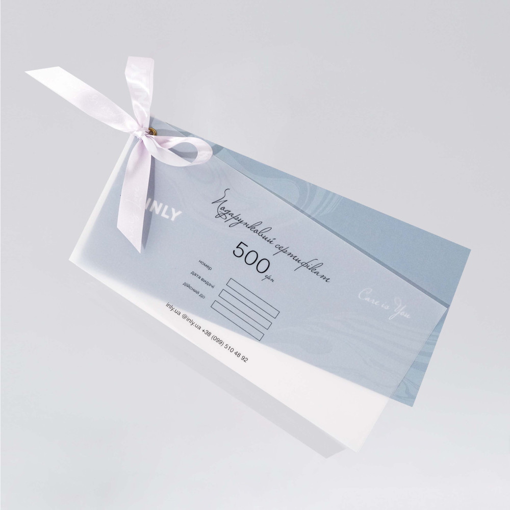 Подарунковий сертифікат надає можливість сплатити за покупку будь-якої продукції в інтернет магазині INLY на вказану в ньому суму.