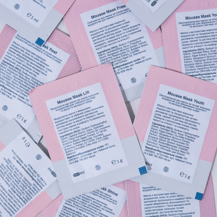 У невелику ємність налийте ≈50 мл чистої води. Відкрийте саше обраної маски, висипте вміст у воду й зачекайте кілька секунд, поки текстура стане мусовою. Нанесіть на очищену та тонізовану шкіру обличчя, шиї та декольте. Залиште на 15–20 хвилин, після чого змийте водою та завершіть догляд кремом.